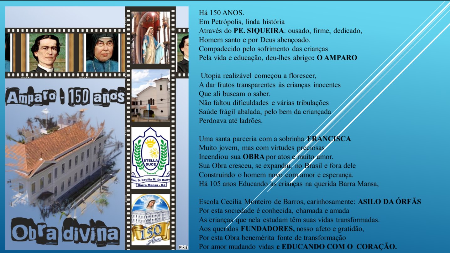 Obrigada a todos que conosco celebram este dia ação de graças, de júbilo e de louvor, pois, o AMPARO, é mística e profecia que atravessa a história, acolhendo, amparando e formando, segundo o Evangelho, o coração de nossas Crianças.