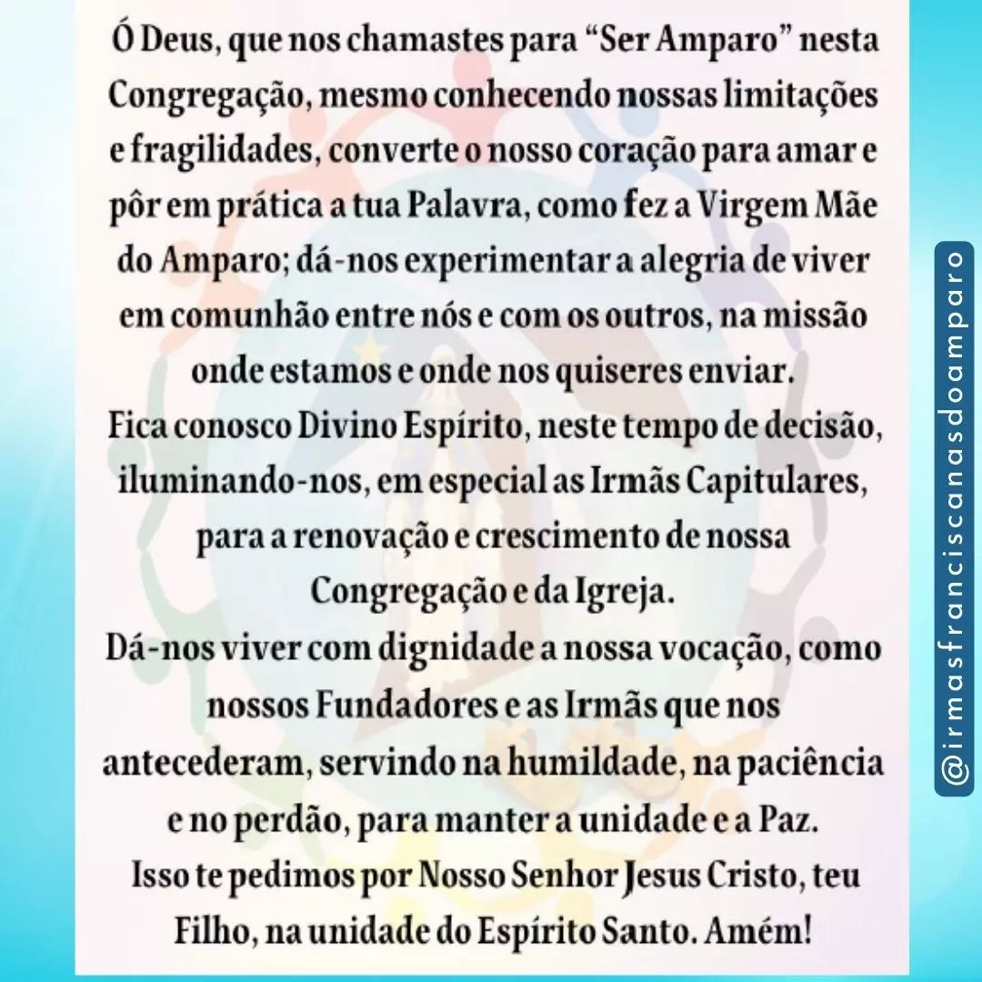 Amparo” nesta Congregação, mesmo conhecendo nossas limitações e fragilidades, converte o nosso coração para amar e pôr em prática a tua Palavra, como fez a Virgem Mãe do Amparo; dá-nos experimentar a alegria de viver em comunhão entre nós e com os outros, na missão onde estamos e onde nos quiseres enviar.