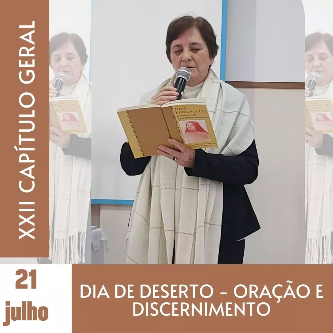 Fica conosco Divino Espírito, neste tempo de decisão, iluminando-nos, em especial as Irmãs Capitulares, para a renovação e crescimento de nossa Congregação e da Igreja. Dá-nos viver com dignidade a nossa vocação, como nossos Fundadores e as Irmãs que nos antecederam, servindo na humildade, na paciência e no perdão, para manter a unidade e a Paz.