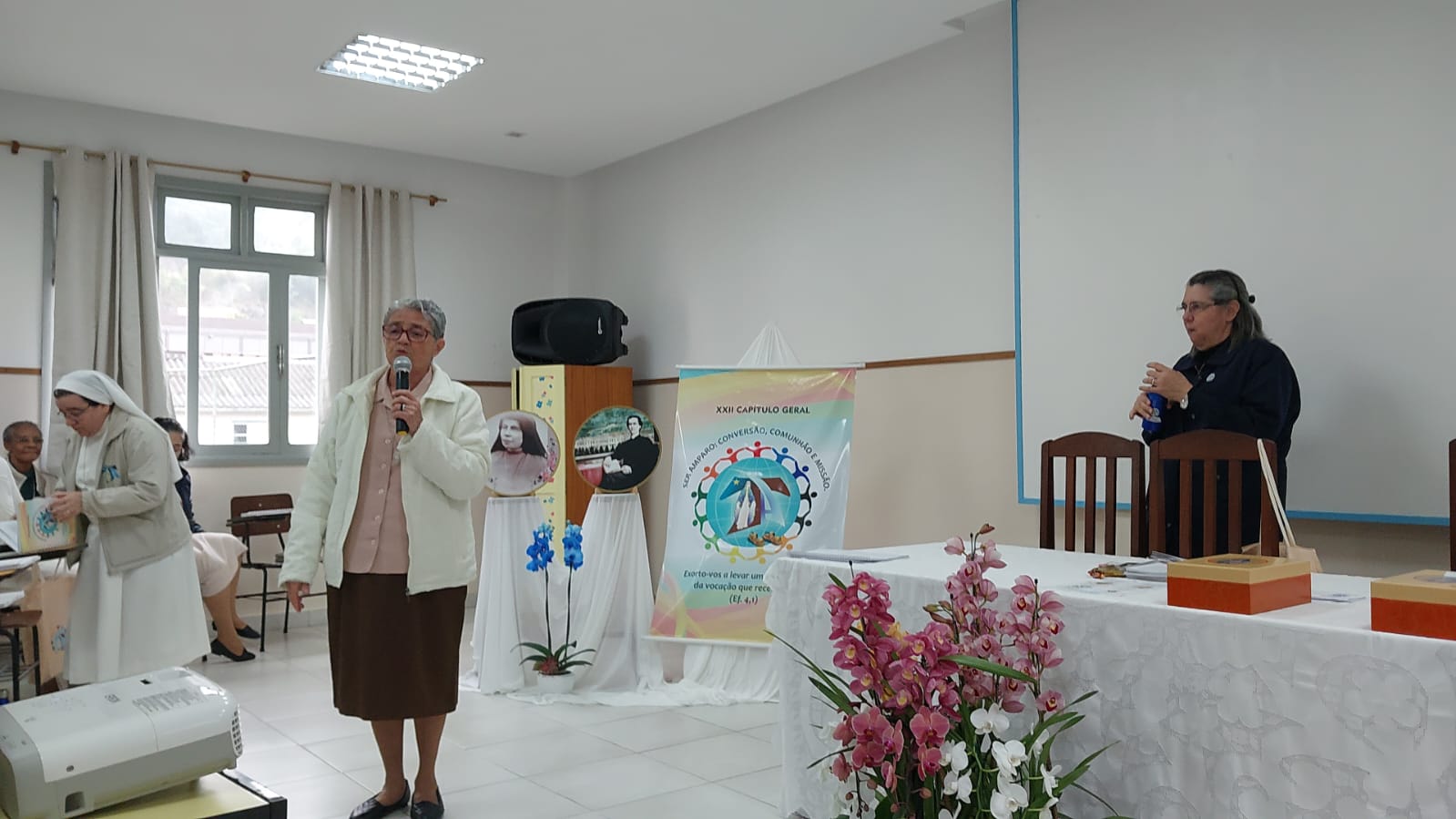 Ao término da celebração Celebração Eucarística, Irmã Silma, Superiora Geral, acolheu a todas as Irmãs, dando assim, abertura o XXII Capítulo Geral Ordinário Eletivo, tempo de graça e de bênção em nossa Congregação. Em seguida seguimos para a Sala Capitular onde aconteceu a instalação do Capítulo.