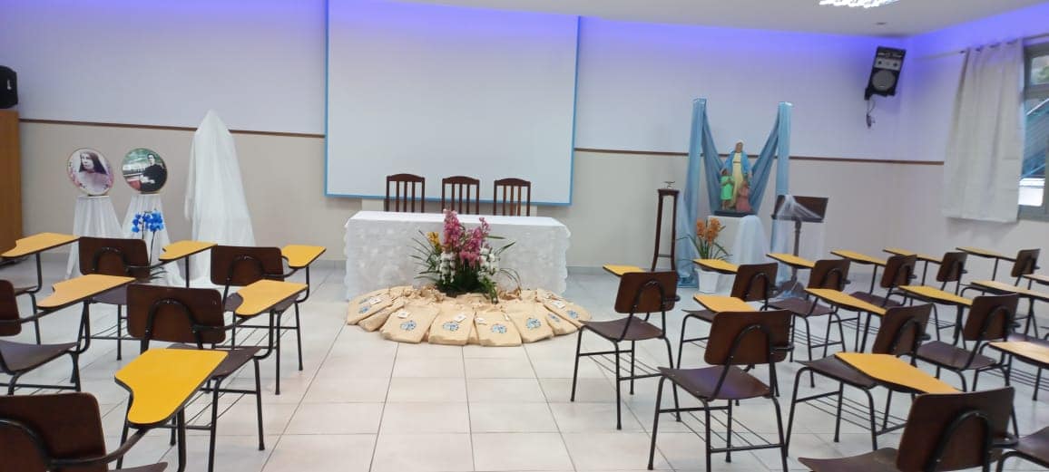 Ambiente: Bíblia, vela, imagem de Nossa Senhora do Amparo, sandálias, Globo ou Mapa Mundi.