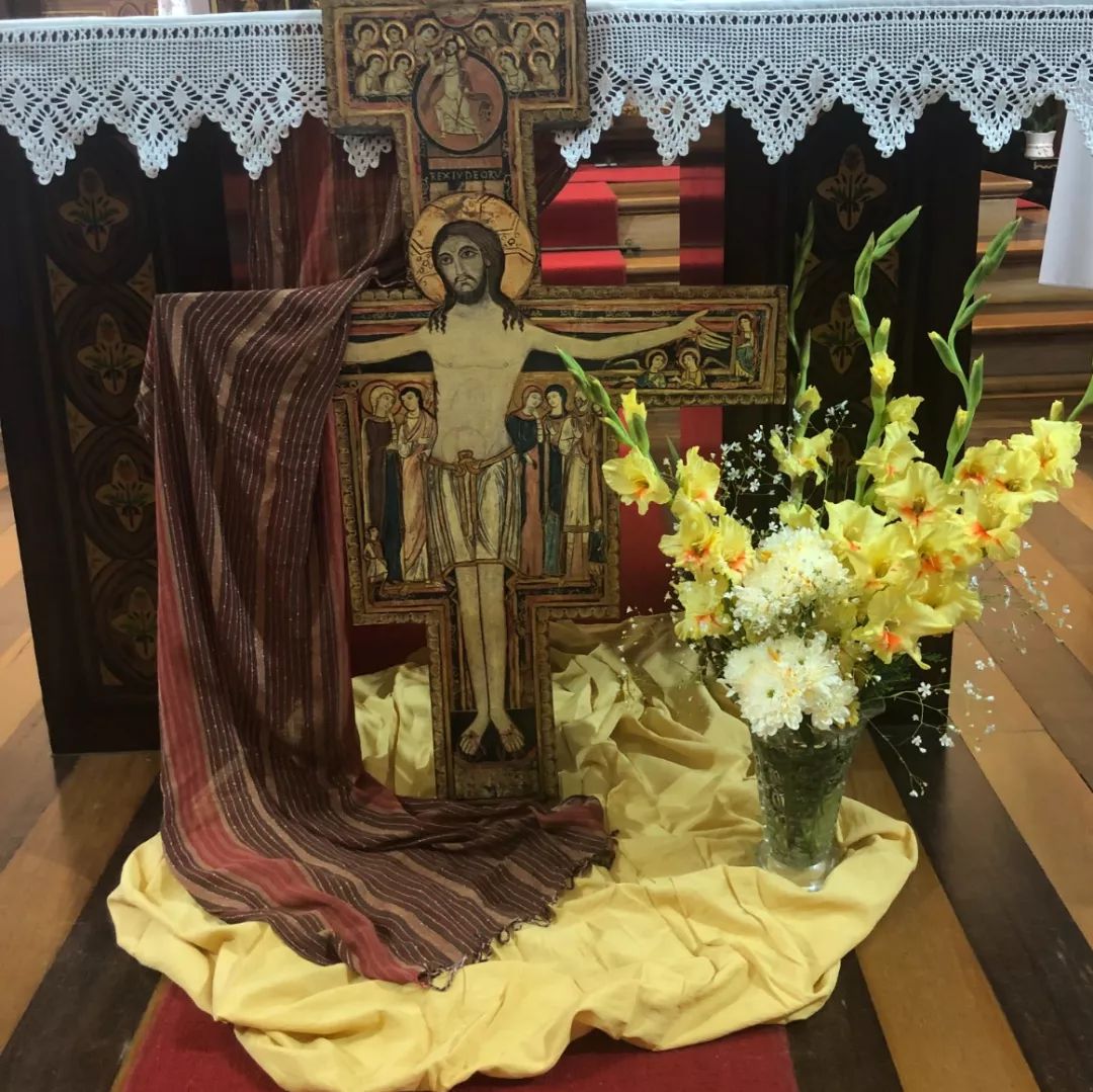 Ambiente: Imagem de Nossa Senhora do Amparo, Bíblia, vela, flores, retrato do Padre Siqueira e Irmã Francisca Pia, Pão e vinho.