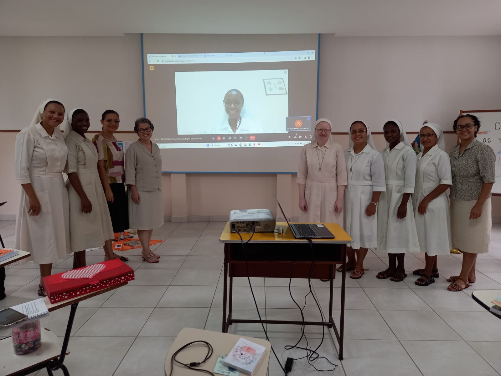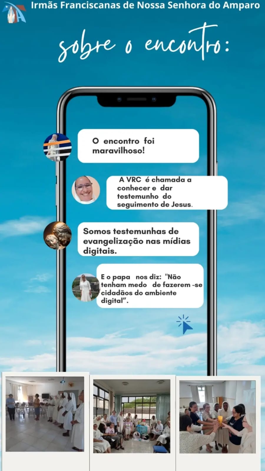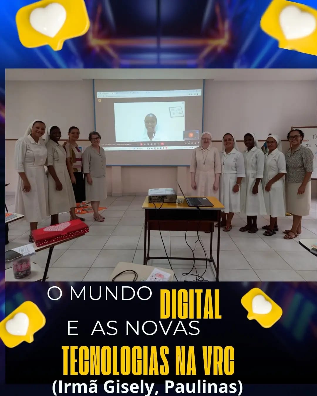 O ambiente digital é lugar transitado por nós Irmãs. Portanto, testemunhar o ser religioso/consagrado neste lugar é uma missão. Há necessidade de percebermos esse ambiente sem ingenuidade, discernindo, com critérios evangélicos, posturas humanizadas e humanizadoras, com foco no bem comum e nos gestos de Amparo – tão caros a nós! Uma tomada de consciência percebendo que temos em nossas mãos uma moeda de duas faces, uma espada de dois gumes. Coerência e disciplina: eis o apelo!03 a 15/01/2024, o encontro em preparação dos Votos Perpétuos de nossas Irmãs: Elidiana e Maria do Carmo e a Primeira Profissão Religiosa das Noviças: Edith e Fernanda.