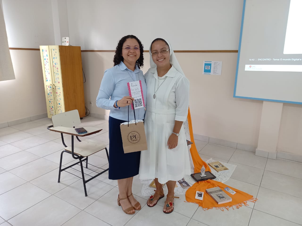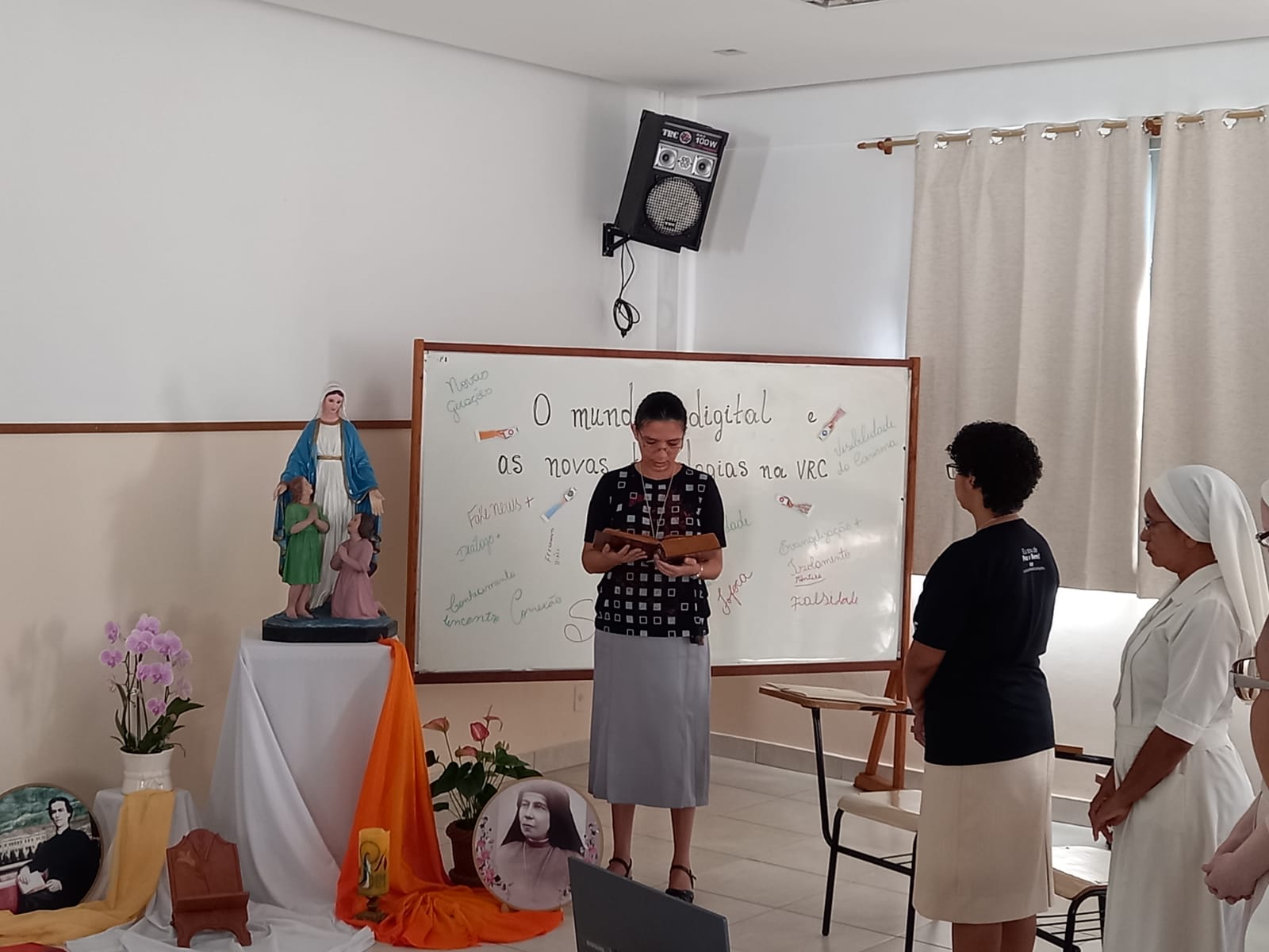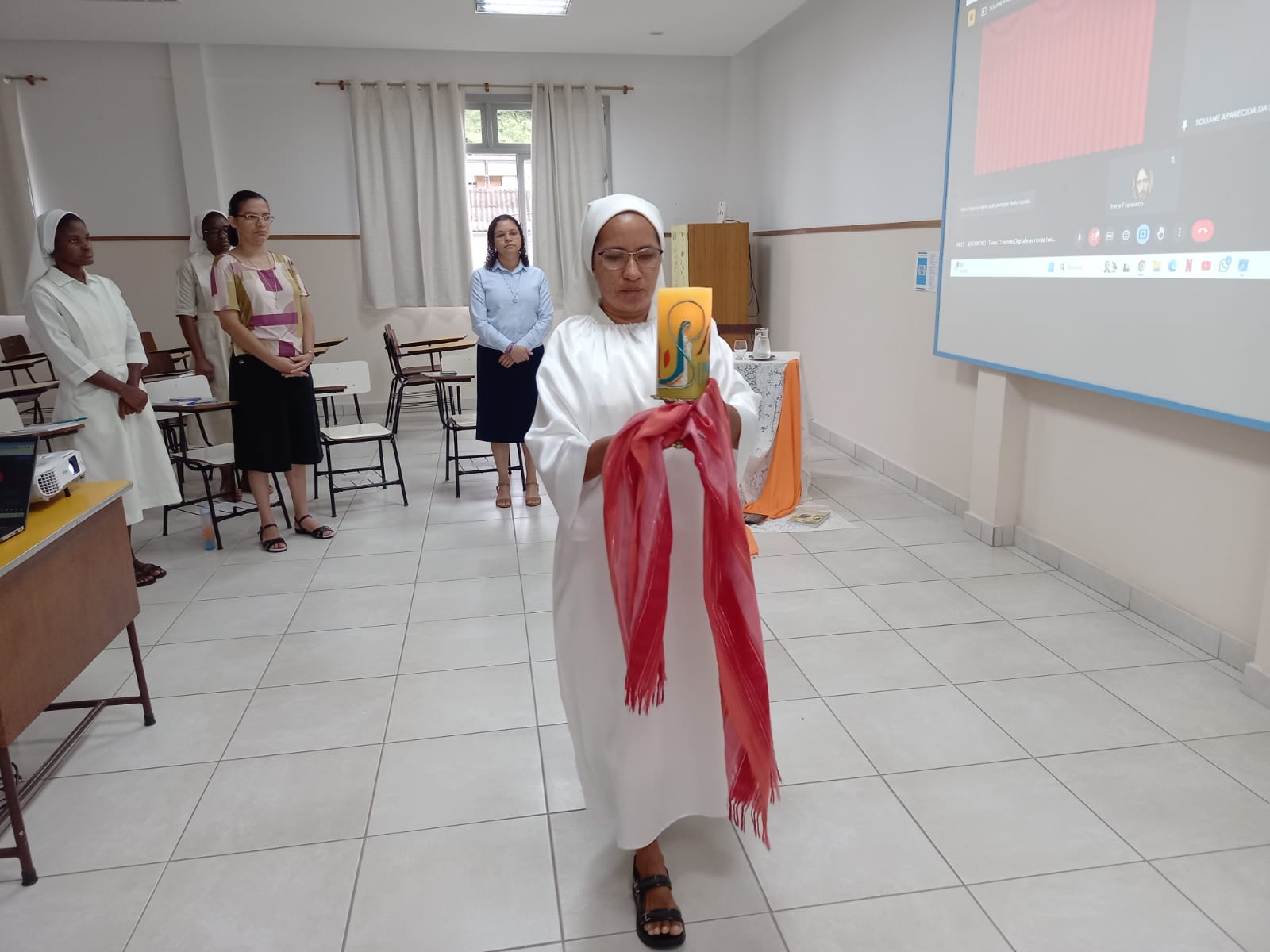 O ambiente digital é lugar transitado por nós Irmãs. Portanto, testemunhar o ser religioso/consagrado neste lugar é uma missão. Há necessidade de percebermos esse ambiente sem ingenuidade, discernindo, com critérios evangélicos, posturas humanizadas e humanizadoras, com foco no bem comum e nos gestos de Amparo – tão caros a nós! Uma tomada de consciência percebendo que temos em nossas mãos uma moeda de duas faces, uma espada de dois gumes. Coerência e disciplina: eis o apelo!03 a 15/01/2024, o encontro em preparação dos Votos Perpétuos de nossas Irmãs: Elidiana e Maria do Carmo e a Primeira Profissão Religiosa das Noviças: Edith e Fernanda.