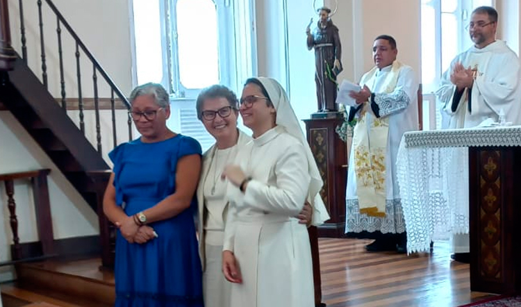 Celebramos no dia 25/01/2025, a Primeira Profissão Religiosa da noviça Ruthielly e o Jubileu de Prata da Irmã Ziula, na Capela de Nossa Senhora do Amparo, em Petrópolis/RJ. A santa Missa foi presidida por Frei Jean Ajluni OFM e concelebrada por Padre Jadson, da Diocese de Itapipoca/CE e Frei Clemente OFM.