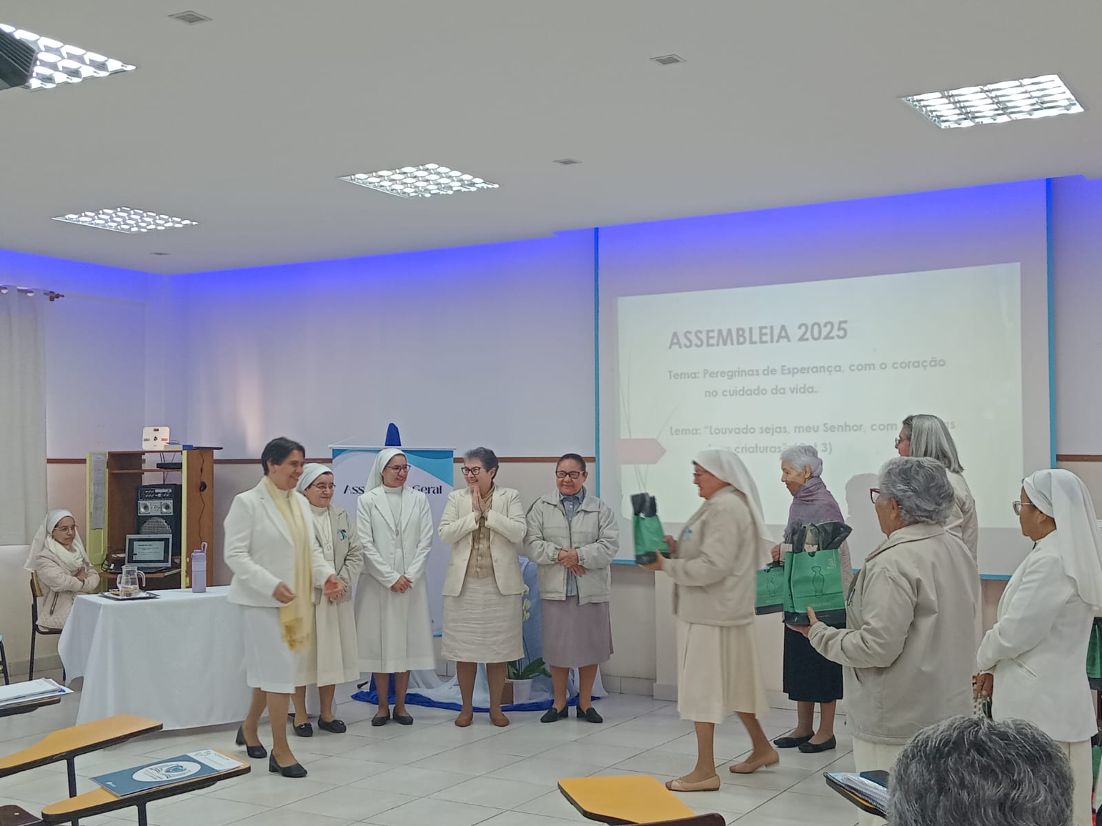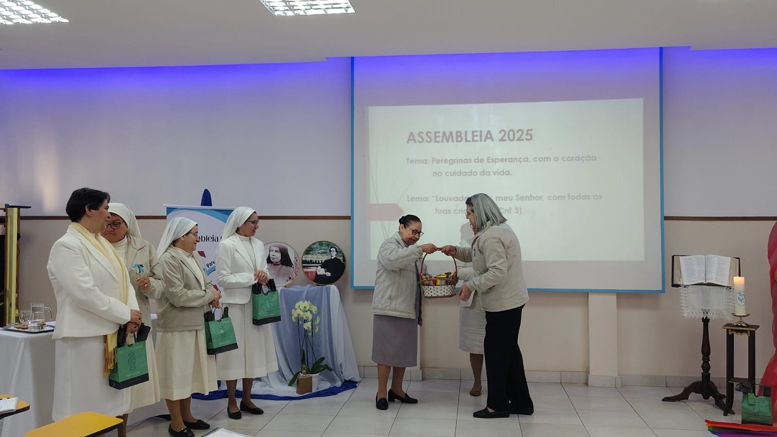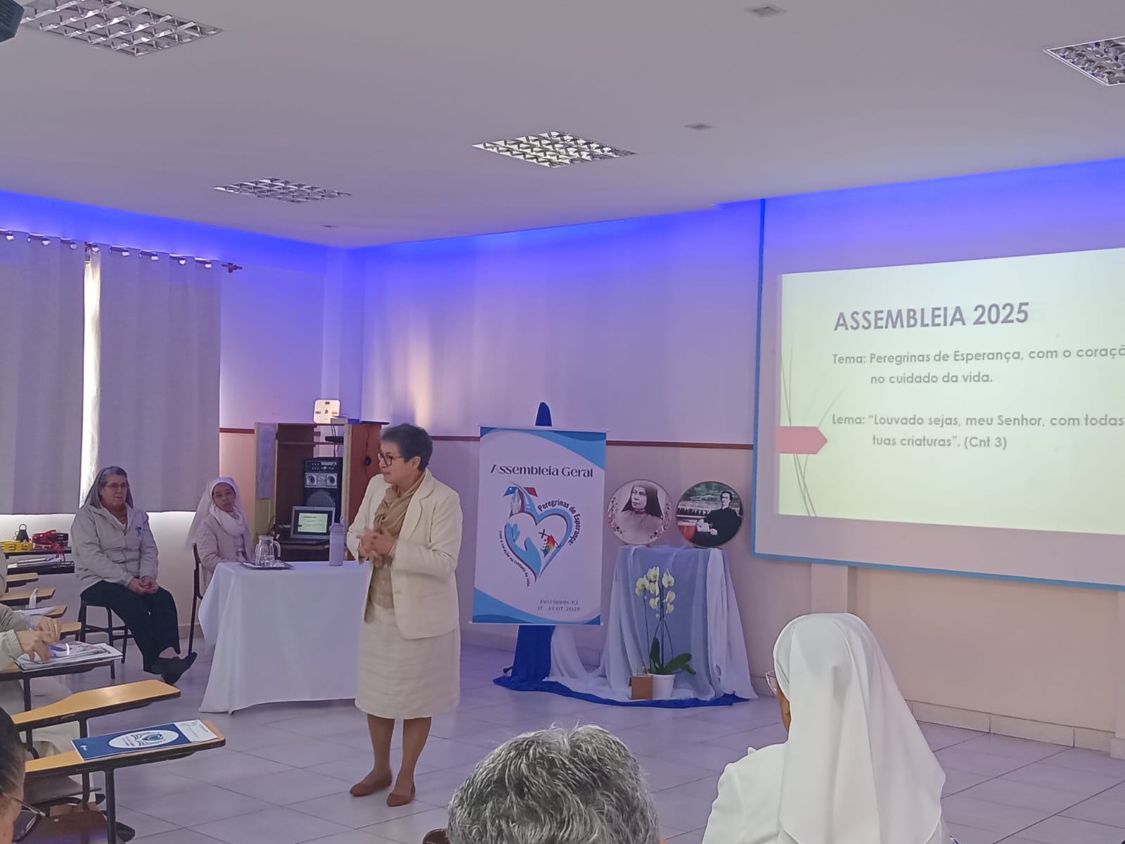 Em seguida, Irmã Cleusa, Ministra Geral, dirigiu palavras de agradecimento e encorajamento a todas as Irmãs presentes e às que acompanharam em oração em nossas fraternidades. Em sua fala, destacou que o verdadeiro fruto da Assembleia é a disposição de cada Irmã em viver o dom do carisma, viver a comunhão e responder com audácia e ternura a graça da vocação e missão.