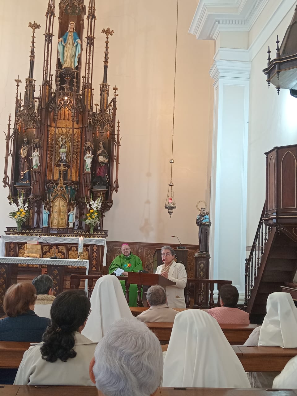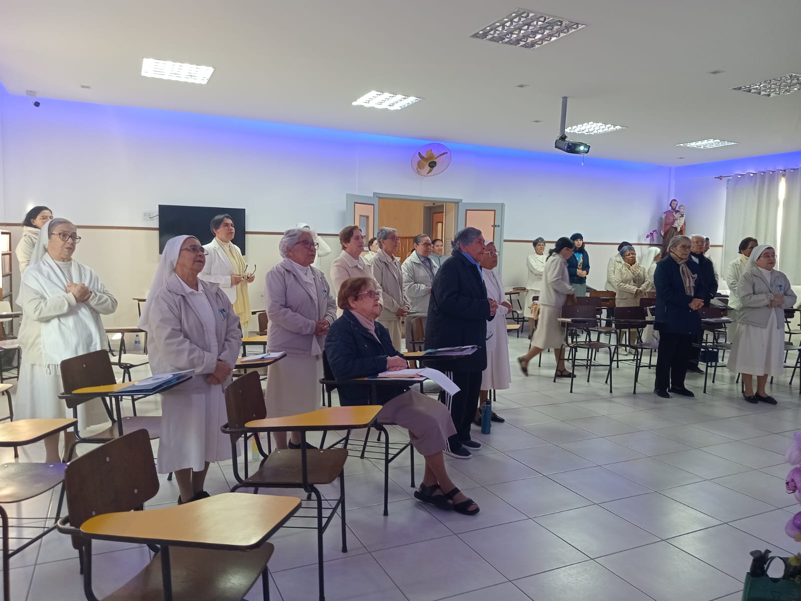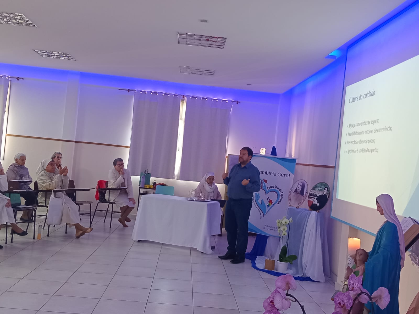 Em seguida, Irmã Cleusa, Ministra Geral, dirigiu palavras de agradecimento e encorajamento a todas as Irmãs presentes e às que acompanharam em oração em nossas fraternidades. Em sua fala, destacou que o verdadeiro fruto da Assembleia é a disposição de cada Irmã em viver o dom do carisma, viver a comunhão e responder com audácia e ternura a graça da vocação e missão.