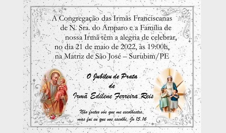Ir. Franciscanas do Amparo Celebração – Jubileu de Prata – Irmã Edilene admin-franciscanas2022-05-23T08:20:42-03:00 Celebração – Jubileu de Prata – Irmã Edileneadmin-franciscanas2022-05-23T08:20:42-03:00